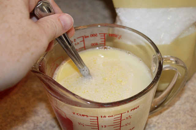 1. In my pyrex measuring glass, I melted the emulsifying wax WITH the oil. (coconut or olive.) The coconut will be a little more white like the 2nd picture as opposed to the 3rd picture – the coconut oil lotion ends up being perfectly white, the olive oil is more of an off-white/creamy color. I put mine in the microwave for about 1 minute and then stirred. (The coconut oil will take a little bit longer to melt, just fyi.)