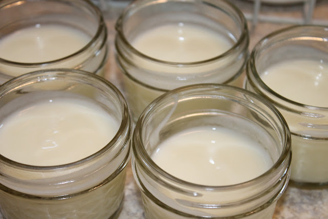 5. I then poured my lotion into the small 4oz jars. I left them open because you want to keep stirring the lotion so that it doesn’t separate. I basically left it on the counter and everytime I walked through the kitchen, I stirred it a few times.